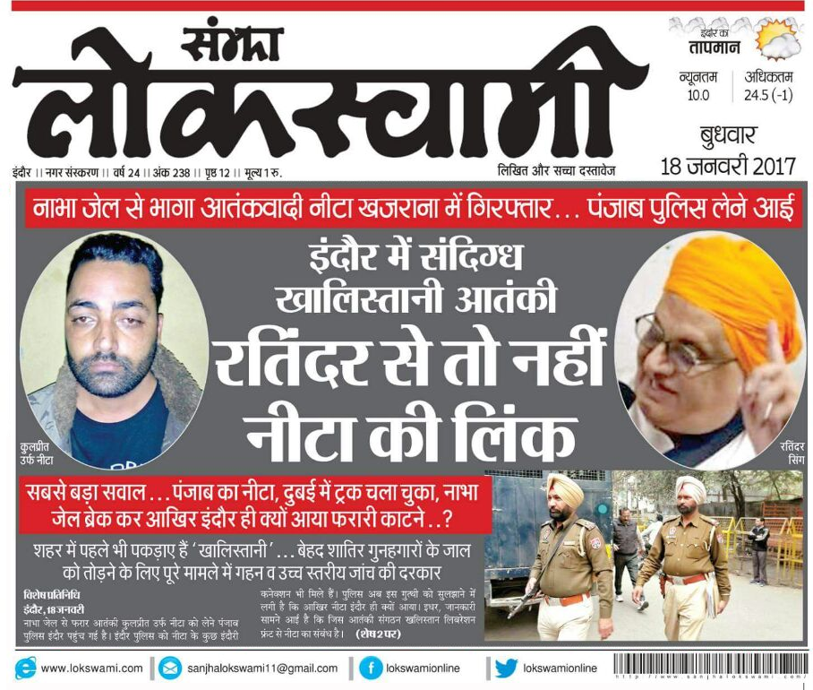 The ‘Sanjha LokSwami’, a Madhya Pardes daily, published a sensational multi-page article, attempting to link Bhai Ratinder Singh to Punjab gangster Neeta (Kulpreet) Deol, who was recently arrested in the city of Indore, referring to Neeta as a ‘Khalistani Terrorist’.